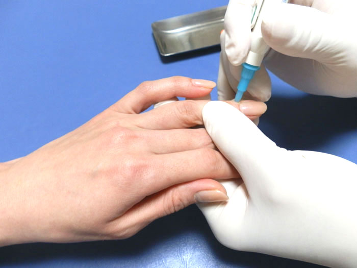 手足の指の特定の場所を専用器具を用い点状に出血させ50滴ほど採ります。